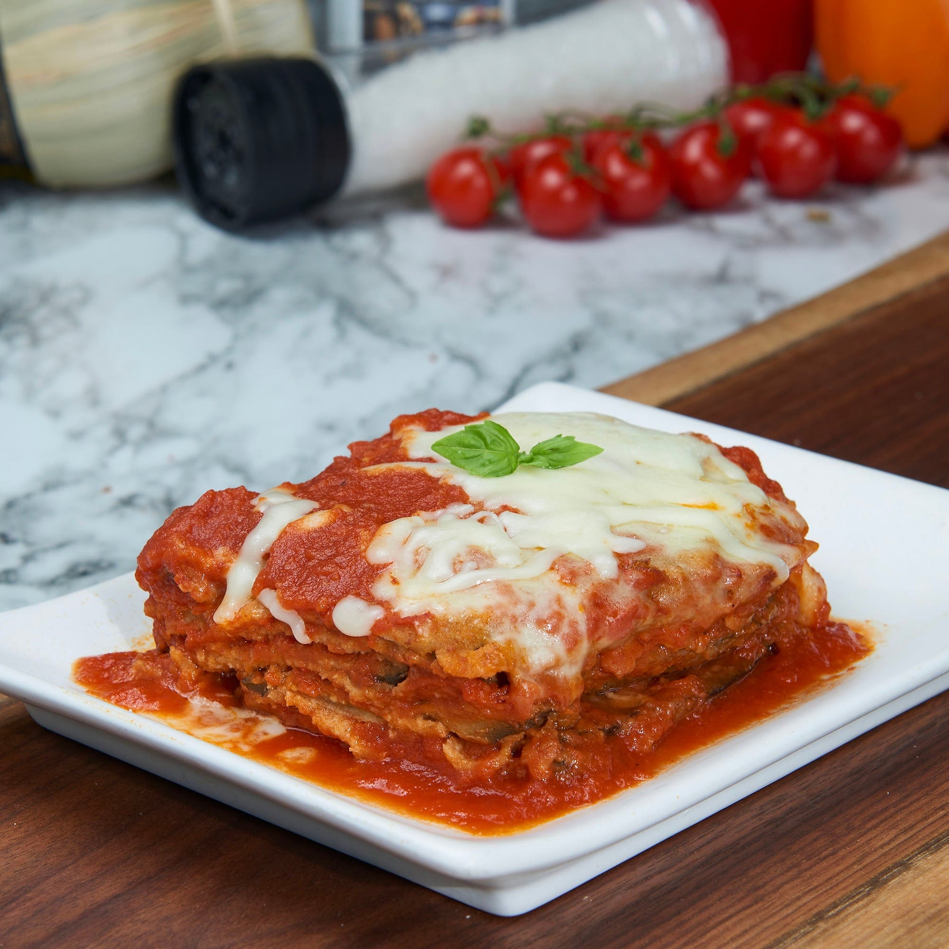 Our Breaded Eggplant Parmigiana is made with thick slices of eggplant lightly dipped in breadcrumbs and parmesan and then oven-baked to golden perfection. Enjoy the crunchy texture and savory flavor in every bite!